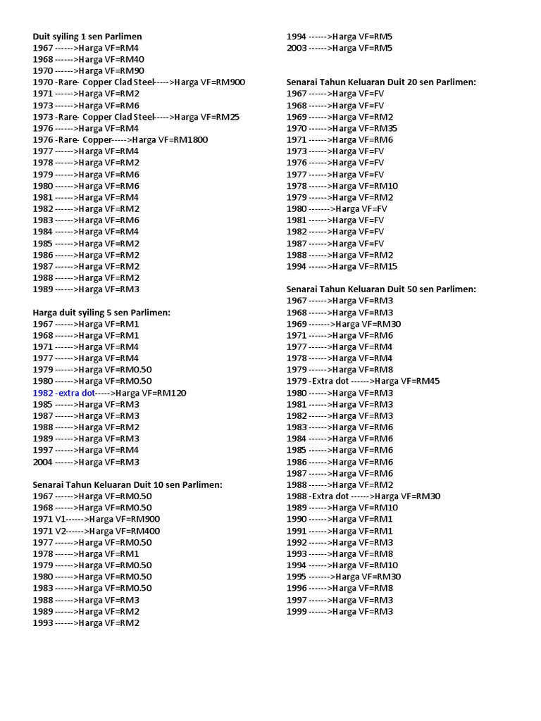 Senarai harga duit lama Wednesday March 2 2022 Edit. Senarai Harga Malaysia Coin Card 4. Siri pertama duit syiling malaysia hanya mula diperkenalkan pada 12 jun 1967 dengan nilai 1 sen 5 sen 10 sen 20 sen 50 sen dan diikuti oleh pengenalan duit syiling 1.
